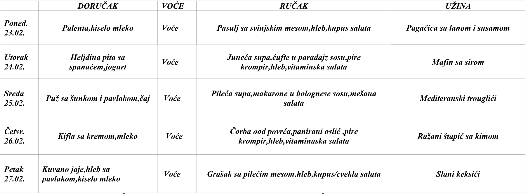Јеловник за 23-27. фебруар 2026.